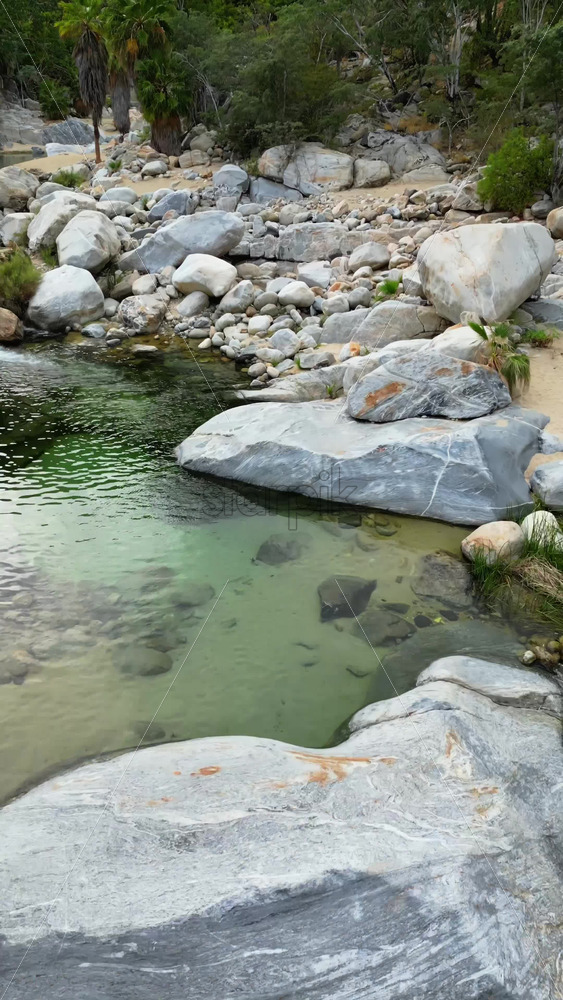 Aerial drone view of a small waterfall cascading between massive rocks into a natural pool in Baja California Sur’s desert canyons. Vertical Royalty Free Stock Video Footage