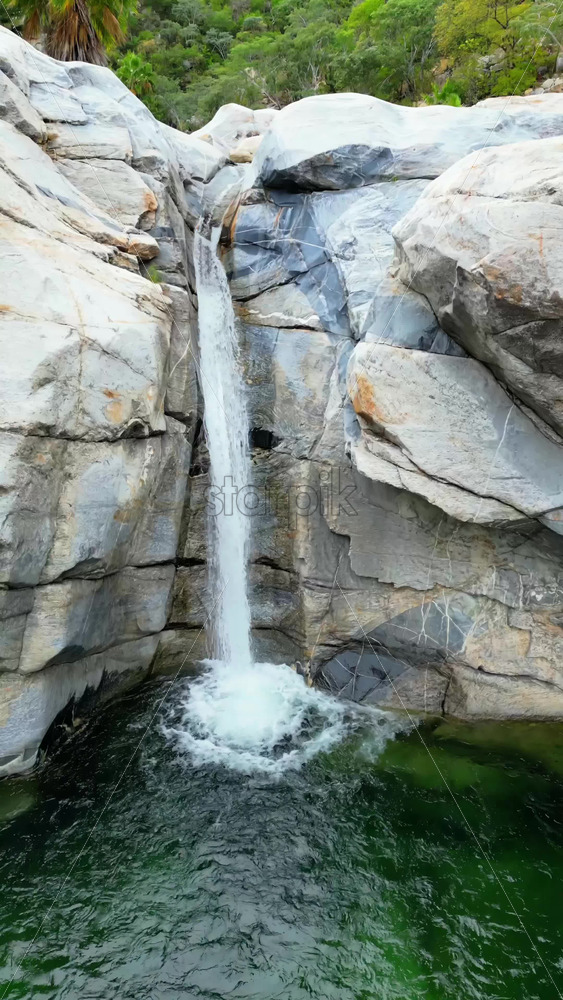 Home » Shop » 1 Video » Video – Aerial drone view of a small waterfall cascading between massive rocks into a natural pool in Baja California Sur’s desert canyons. Vertical
