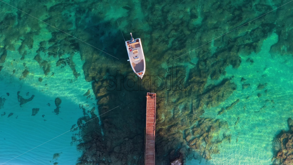 Aerial drone view of a small white boat moored to a wooden pier above the transparent, emerald colored water of Ksamil Royalty Free Stock Video Footage