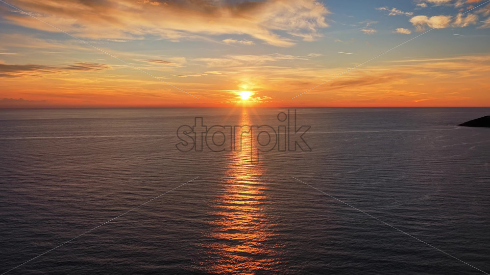 Aerial drone view of a vivid sunset over calm open sea, with warm orange and red tones glowing across the horizon. Montenegro Royalty Free Stock Video Footage