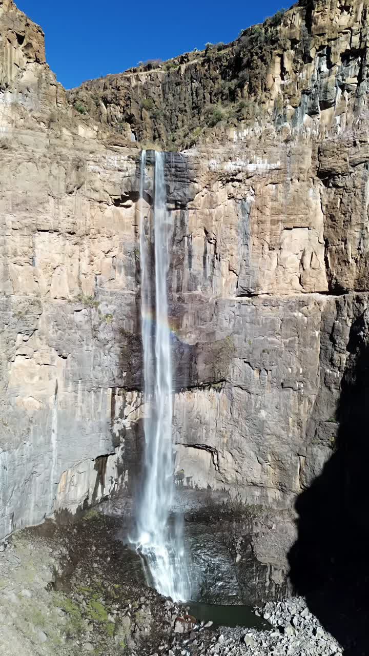 Video – Aerial drone view of a tall waterfall dropping from a rocky cliff into a canyon below, with a faint rainbow visible in the mist and rugged mountain landscape surrounding it. Vertical