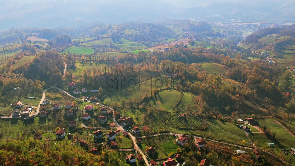 Aerial drone view of a traditional Bosnian rural landscape with scattered homes, winding roads, farmland, and forested hills Royalty Free Stock Video Footage
