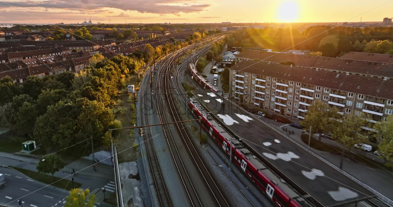 Video Aerial drone view of a train moving on the tracks near Vesterbro district in Copenhagen, Denmark at sunset Royalty Free Stock Video Footage