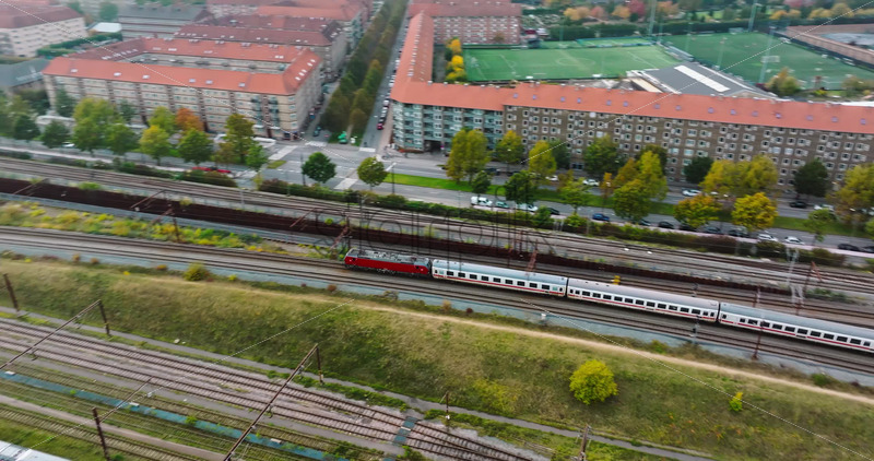 Video Aerial drone view of a train moving on the tracks near Vesterbro district in Copenhagen, Denmark Royalty Free Stock Video Footage