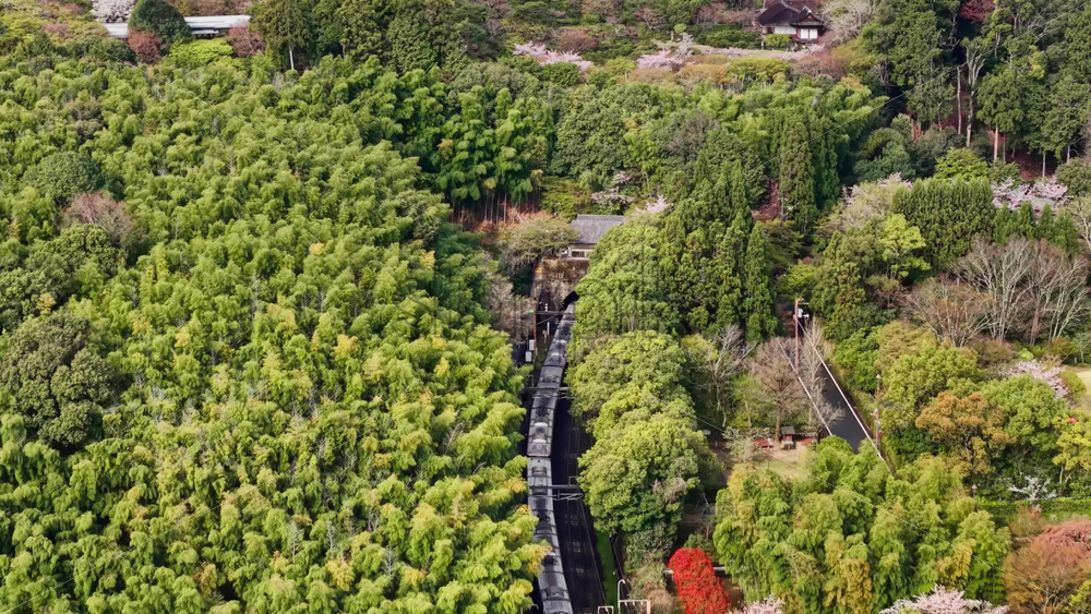 video Aerial drone view of a train moving through the Arashiyama train station, Kyoto, Japan in daylight Royalty Free Stock Video Footage