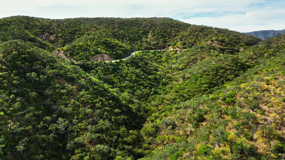 Aerial drone view of a peaceful river winding through a lush palm oasis in Baja California Sur Royalty Free Stock Video Footage