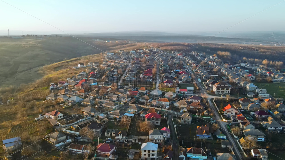 Home » Shop » 1 Video » Video – Aerial drone view of a village. View of multiple residential buildings, country roads, bare trees. Sunny weather. Moldova