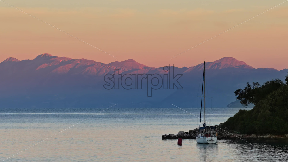 Aerial drone view of a yacht anchored near the rocky shore of Ksamil, Albania, framed by soft mountain silhouettes and calm reflective waters Royalty Free Stock Video Footage