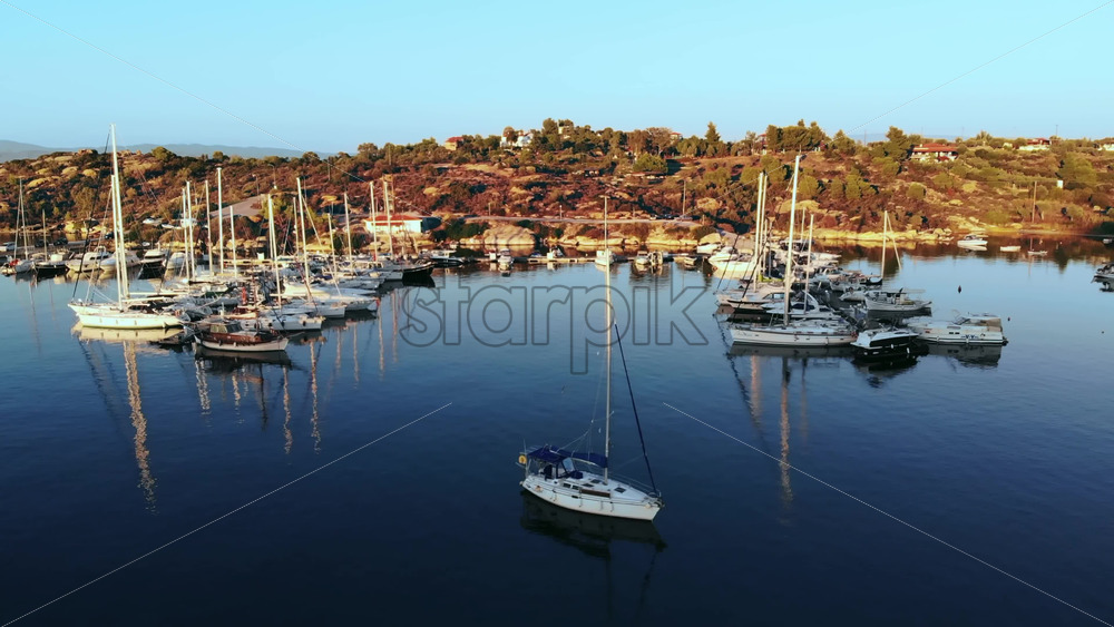 Aerial drone view of Aegean sea port with multiple moored yachts at piers, greenery, blue water, sunset, Greece Royalty Free Stock Video Footage
