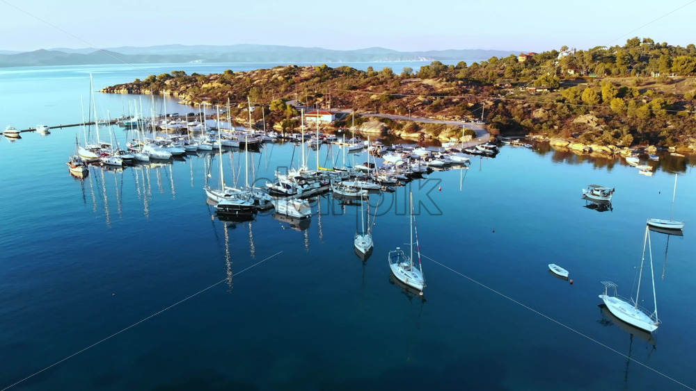 Aerial drone view of Aegean sea port with multiple moored yachts at piers, greenery, blue water, sunset, Greece Royalty Free Stock Video Footage