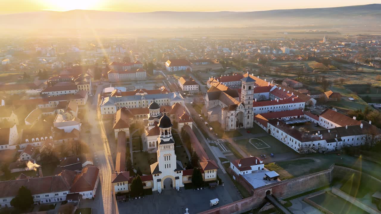 Aerial drone view of Alba Carolina Citadel in Alba Iulia, Romania. Star shaped Vauban fortress featuring historic cathedrals, fortified walls, and symmetrical urban layout Royalty Free Stock Video Footage