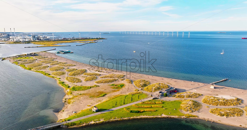 VIDEO Aerial drone view of Amager Beachpark seaside public park in Copenhagen, Denmark Royalty Free Stock Video Footage