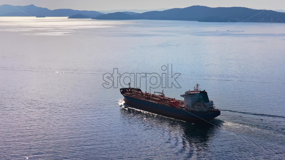 Aerial drone view of an oil tanker traveling across open Adriatic waters with distant mountain ridges and coastal towns visible on the horizon. Water sparkling reflection Royalty Free Stock Video Footage
