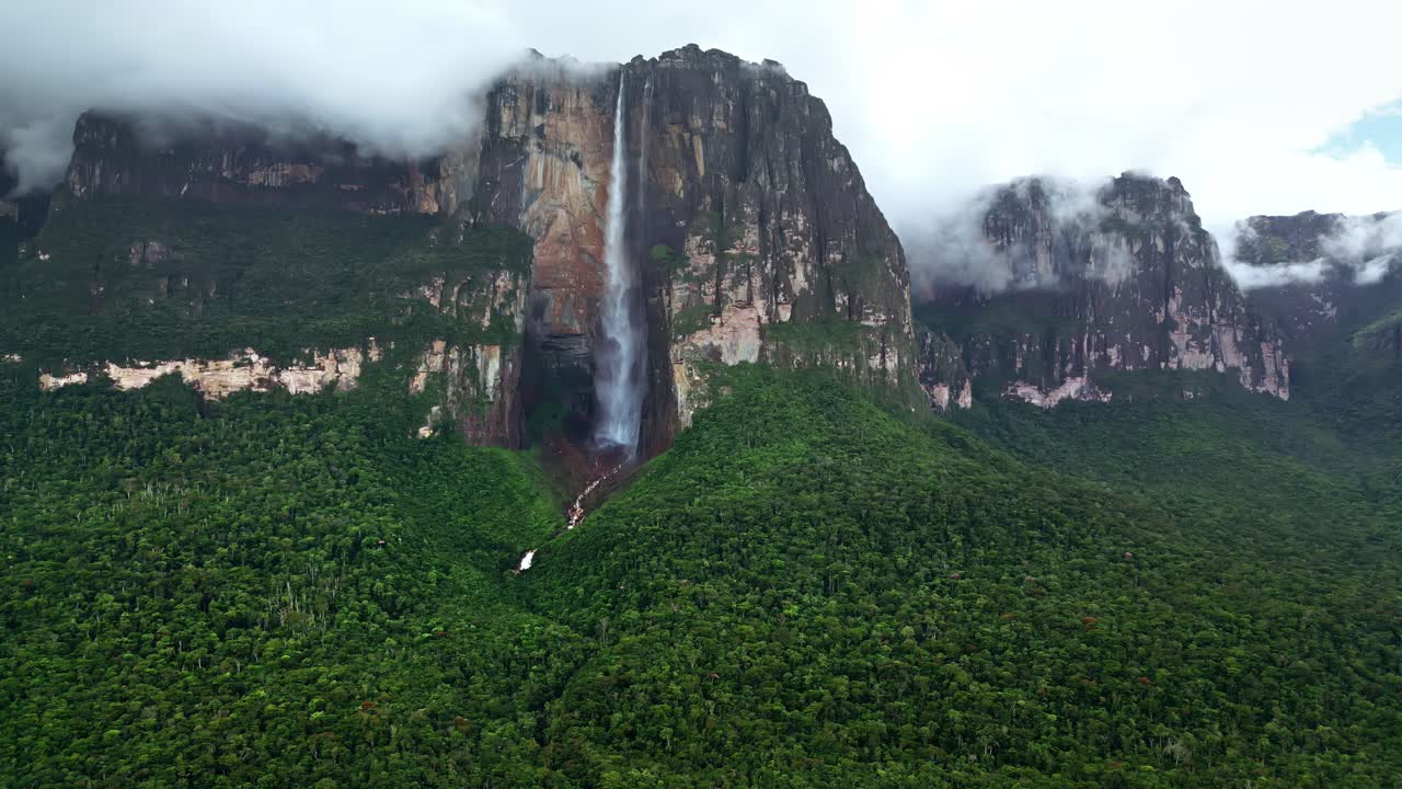 Aerial drone view of Angel Falls flowing down the cliffs of Auyan-tepui with clouds drifting across the mountains in Canaima National Park, Venezuela Royalty Free Stock Video Footage