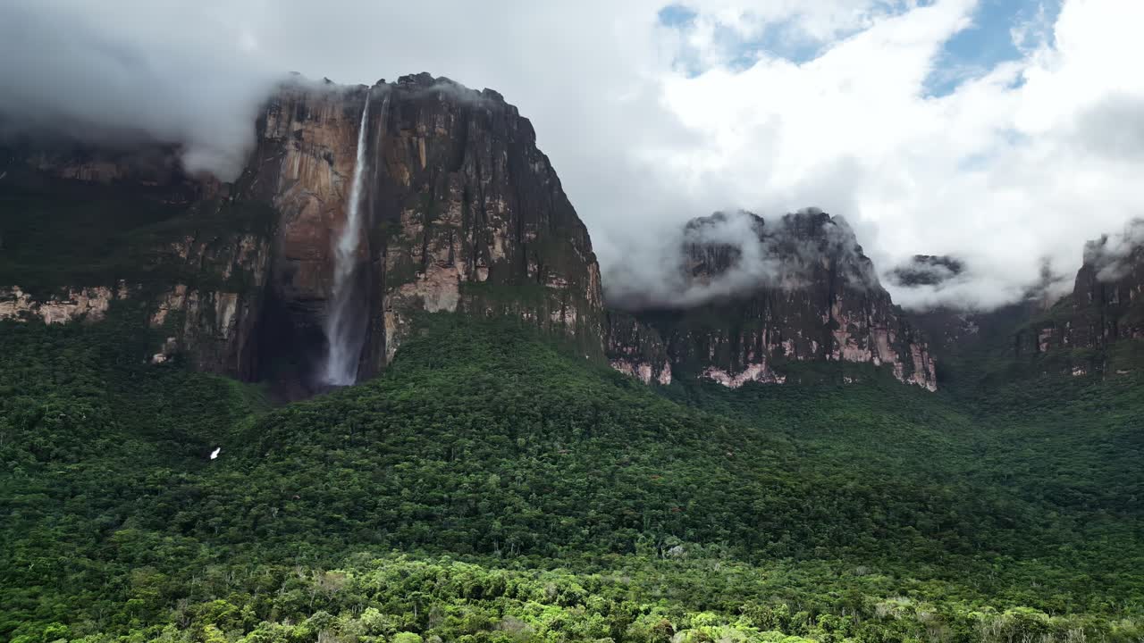 Aerial drone view of Angel Falls flowing down the cliffs of Auyan-tepui with clouds drifting across the mountains in Canaima National Park, Venezuela Royalty Free Stock Video Footage