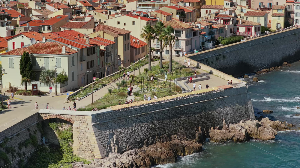 Aerial drone view of Antibes stone ramparts and seaside promenade with visitors walking along the walls, overlooking the rocky Mediterranean coast Royalty Free Stock Video Footage