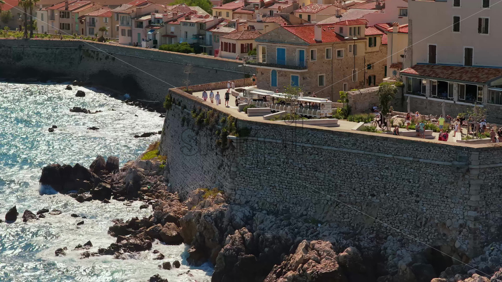 Aerial drone view of Antibes stone ramparts and seaside promenade with visitors walking along the walls, overlooking the rocky Mediterranean coast Royalty Free Stock Video Footage