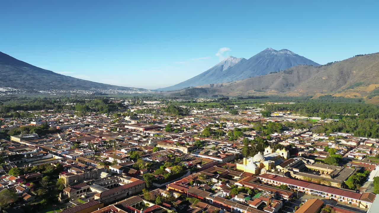 Aerial drone view of Antigua Guatemala city with Volcan de Agua rising dramatically in the background Royalty Free Stock Video Footage