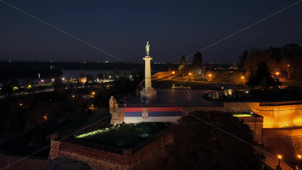 Aerial drone view of Belgrade’s iconic Victor Monument, beautifully lit against the fortress and old architecture at night Royalty Free Stock Video Footage