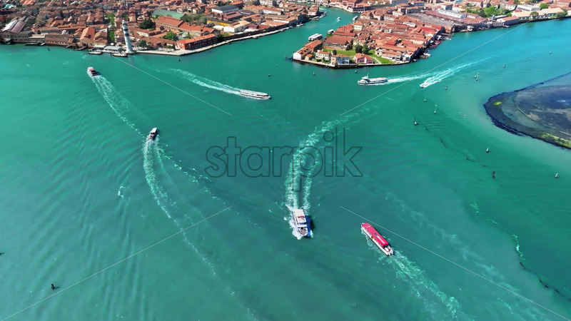 VIDEO Aerial drone view of boats moving near Murano Island, Venice, Italy Royalty Free Stock Video Footage