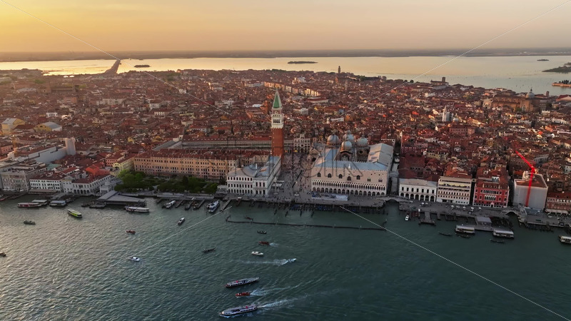 VIDEO Aerial drone view of boats moving near Venice City, Italy, at sunset Royalty Free Stock Video Footage