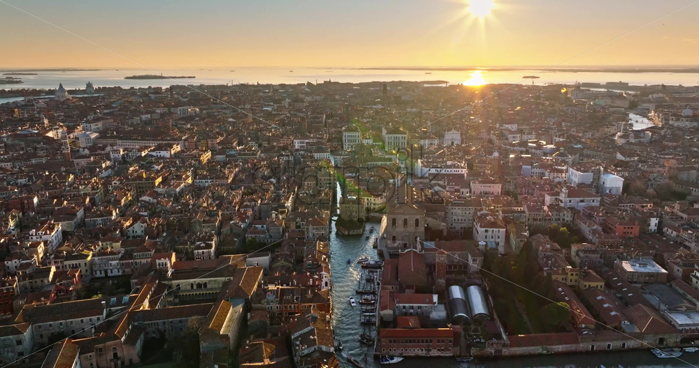 VIDEO Aerial drone view of boats moving through Venice City, Italy, at sunset Royalty Free Stock Video Footage