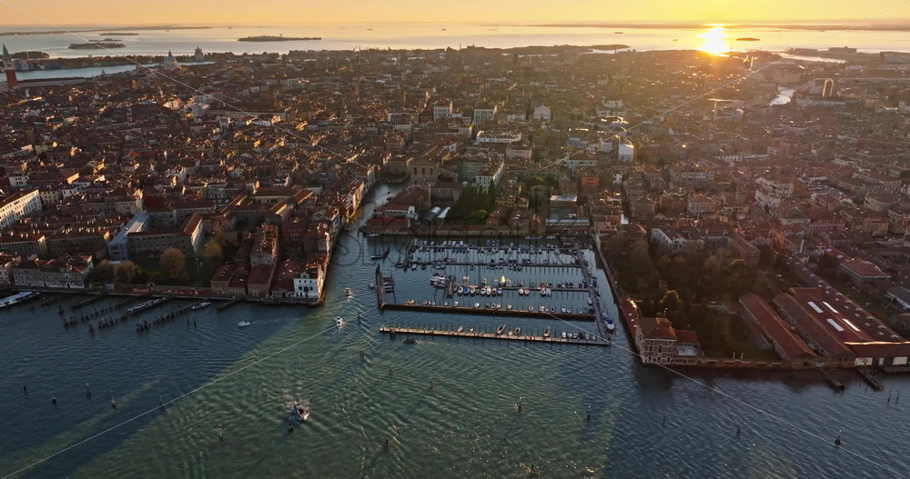 VIDEO Aerial drone view of boats moving near Venice City, Italy at sunset Royalty Free Stock Video Footage
