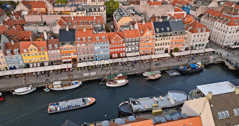 Home » Shop » 1 Video » Video Aerial drone view of boats on the Nyhavn waterfront, canal and entertainment district in Copenhagen, Denmark in daylight