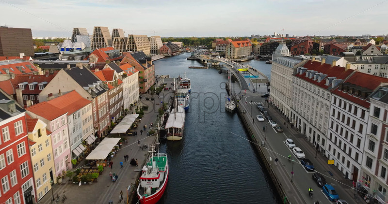 Video Aerial drone view of boats on the Nyhavn waterfront, canal and entertainment district in Copenhagen, Denmark in daylight Royalty Free Stock Video Footage