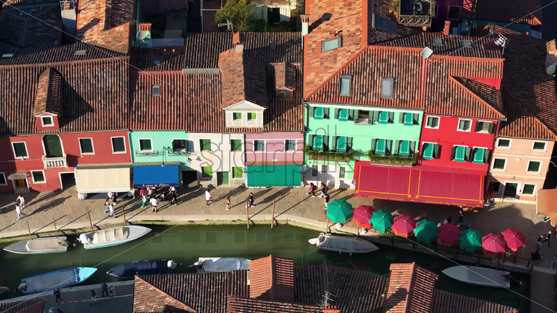 VIDEO Aerial drone view of boats on the sides of a canal near the colourful houses of Burano island, Italy Royalty Free Stock Video Footage