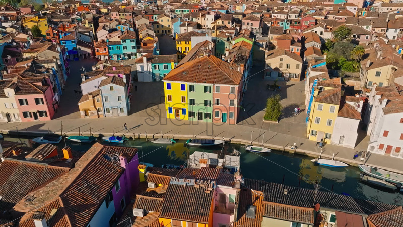 VIDEO Aerial drone view of boats on the sides of a canal near the colourful houses of Burano Island, Italy Royalty Free Stock Video Footage