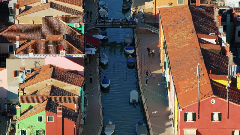 VIDEO Aerial drone view of boats on the sides of a canal near the colourful houses of Burano, Italy Royalty Free Stock Video Footage