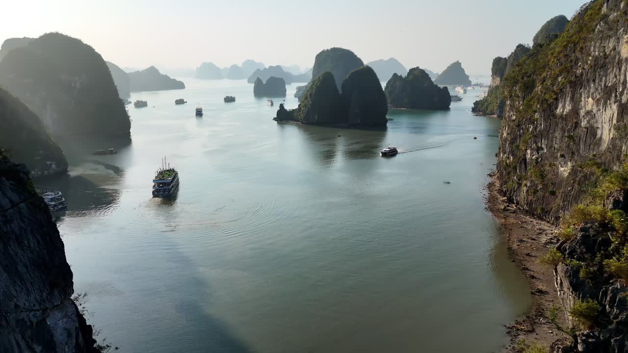 Aerial drone view of boats sailing between limestone karst islands in Ha Long Bay, Vietnam, a UNESCO World Heritage site known for its spectacular seascape Royalty Free Stock Video Footage