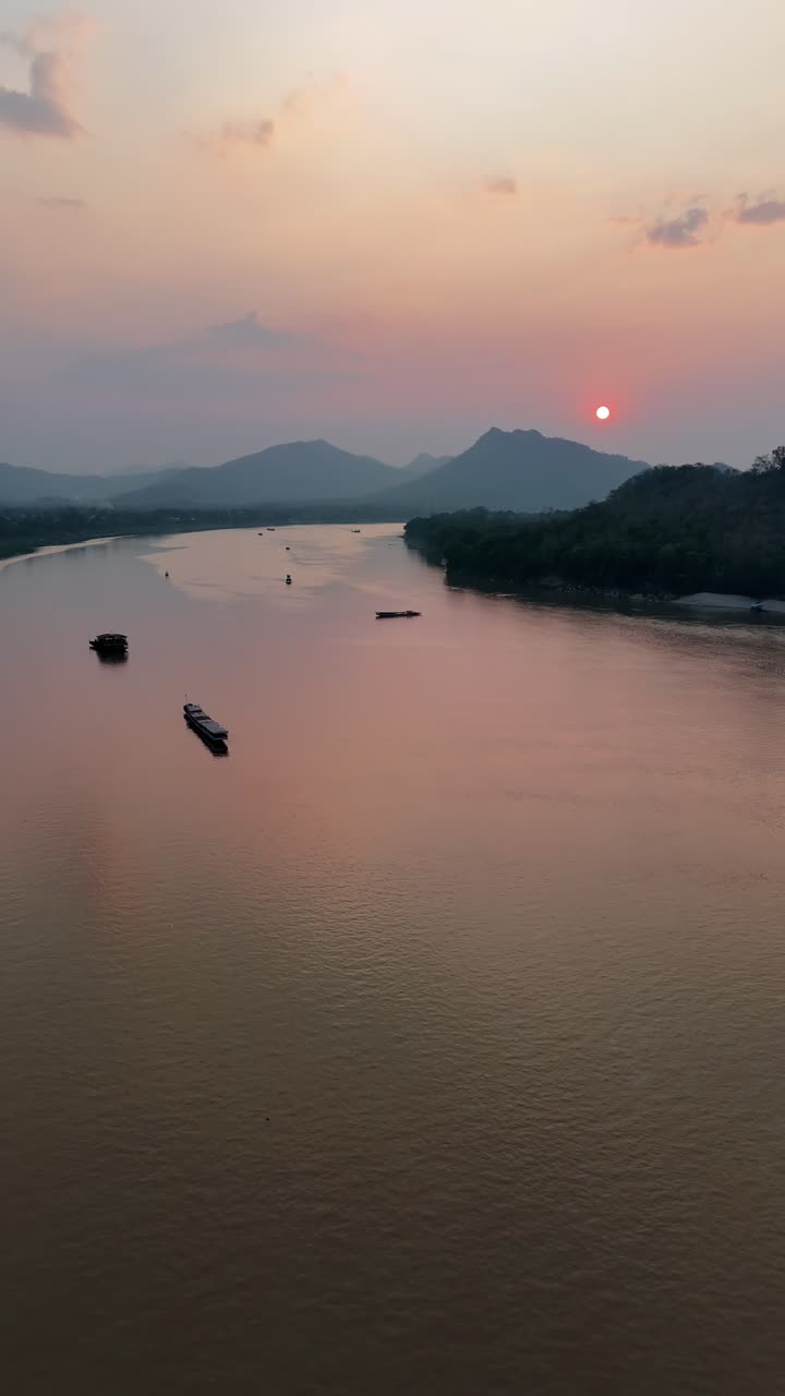 Aerial drone view of boats traveling along the Mekong River during sunset in Laos, with warm orange light reflecting on the calm water and mountains fading into the distance. Vertical Royalty Free Stock Video Footage