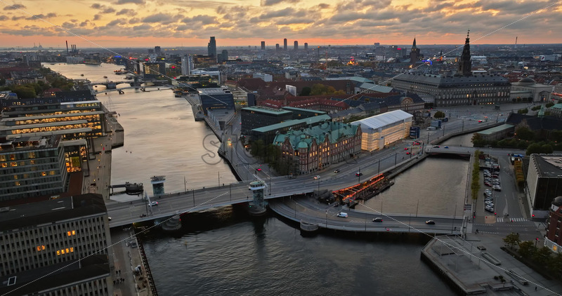 Video Aerial drone view of Borsen historical place in Copenhagen, Denmark at night Royalty Free Stock Video Footage