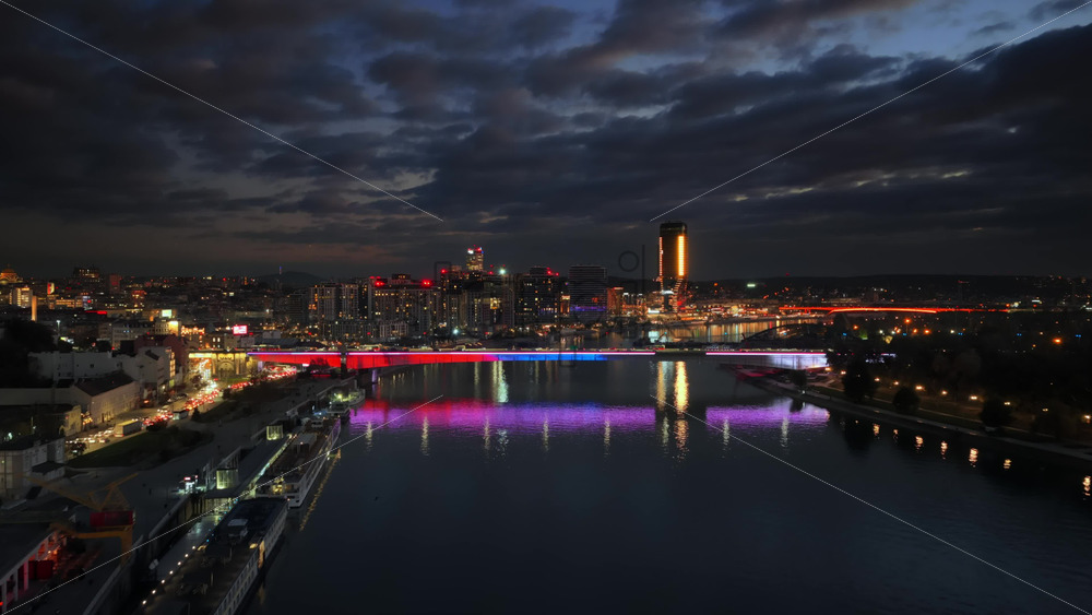 Aerial drone view of Branko’s Bridge in Belgrade, Serbia, illuminated in colorful lights reflecting off the Sava River. Royalty Free Stock Video Footage