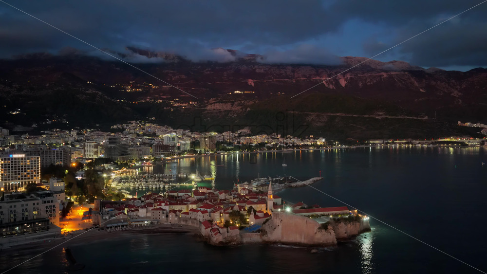 Aerial drone view the mountains glow in orange light while the Budva Old Town sits along the water Royalty Free Stock Video Footage