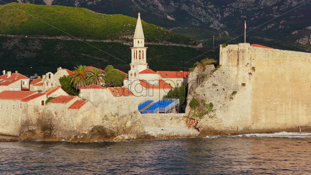 Home » Shop » 1 Video » Video – Aerial drone view of Budva Old Town, showing its medieval stone buildings, red rooftops, fortress walls, and church tower along the coastline, with modern city buildings and mountains in the background. Montenegro