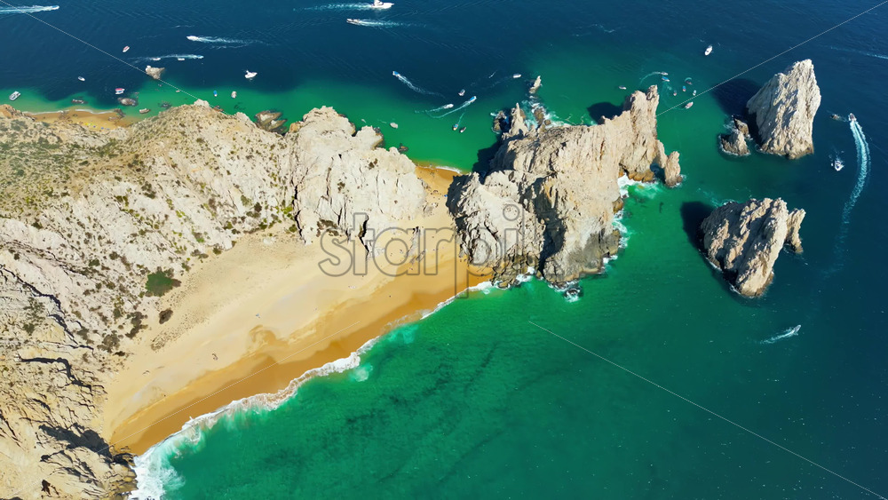 Aerial drone view of Lover’s Beach, one of the most famous beaches in Cabo San Lucas, framed by monumental rock cliffs and emerald waters. Vertical Royalty Free Stock Video Footage