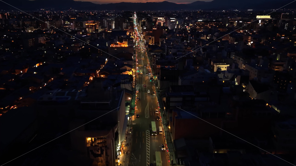 video Aerial drone view of cars moving on the streets of Kyoto, Japan at night Royalty Free Stock Video Footage