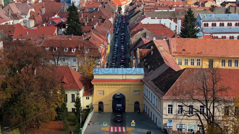 Video Aerial drone view of cars passing under the Schei Gate in Brasov, Romania Royalty Free Stock Video Footage