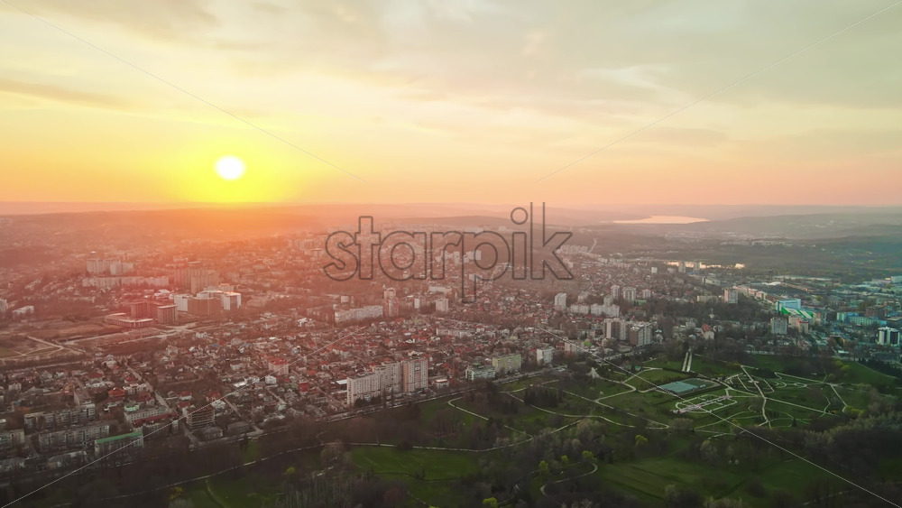 Aerial drone view of Chisinau at sunset. Multiple buildings, trees, park, setting sun. Moldova Royalty Free Stock Video Footage