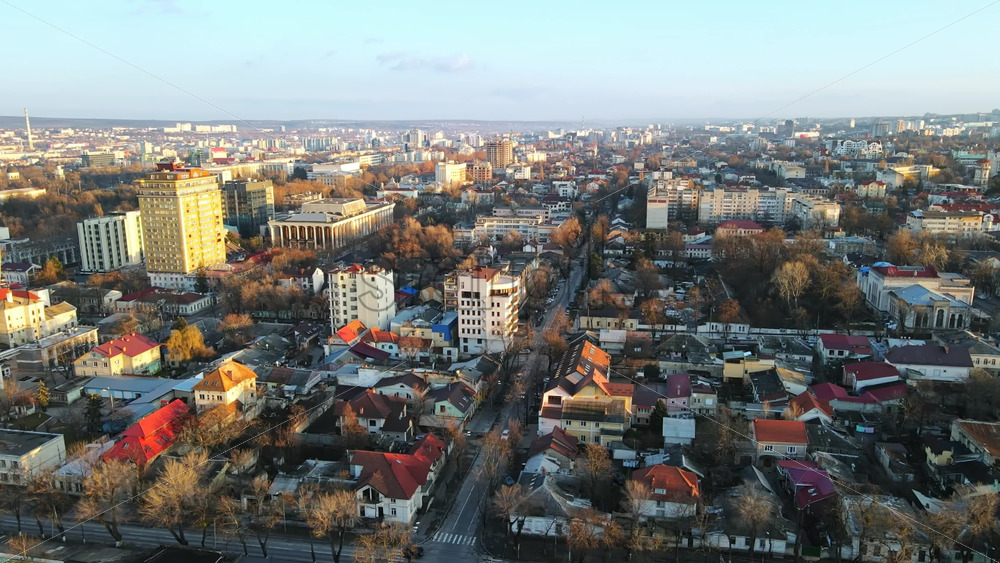 Aerial drone view of Chisinau at sunset. Panorama view of multiple buildings in city center, roads with moving cars, central park with bare trees. Moldova Royalty Free Stock Video Footage Royalty Free Stock Video Footage