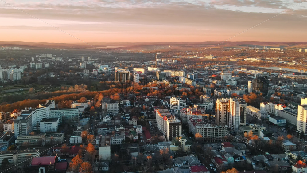 Aerial drone view of Chisinau at sunset. Panorama view of multiple buildings in city center, roads with moving cars, central park with bare trees. Moldova Royalty Free Stock Video Footage Royalty Free Stock Video Footage
