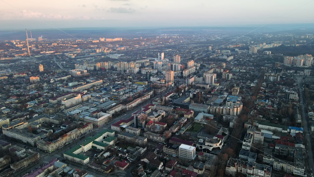 Aerial drone view of Chisinau at sunset. Panorama view of multiple buildings in city center, roads with moving cars, central park with bare trees. Moldova Royalty Free Stock Video Footage Royalty Free Stock Video Footage