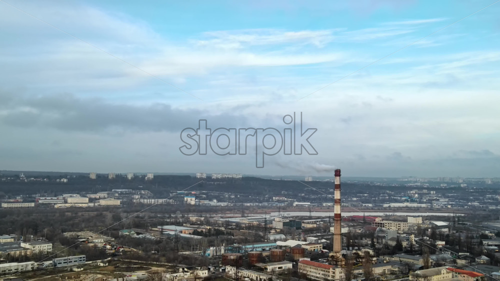 Aerial drone view of Chisinau. Tube of the thermal station with smoke coming out. Industrial zone near it and cityscape on the background. Cloudy weather. Moldova Royalty Free Stock Video Footage Royalty Free Stock Video Footage