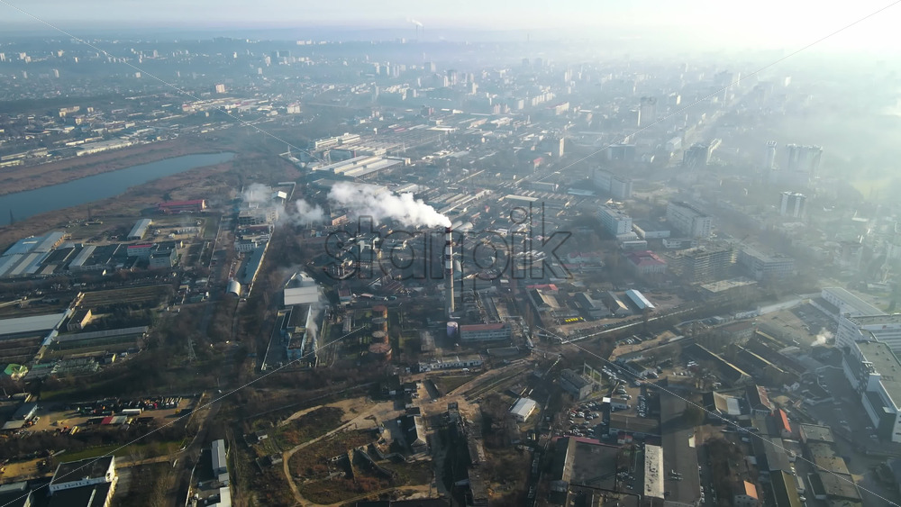 Aerial drone view of Chisinau. Thermal station with smoke coming out of the tube. Buildings, roads, lake. Fog in the air. Moldova Royalty Free Stock Video Footage Royalty Free Stock Video Footage