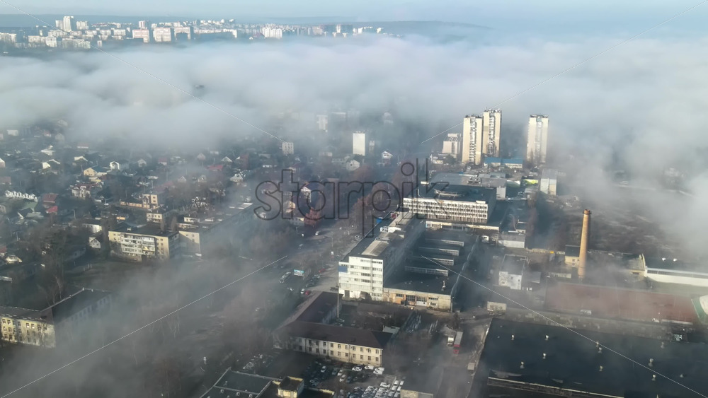 Aerial drone view of Chisinau through the clouds. Panorama view of multiple buildings, roads with moving cars and bare trees. Moldova Royalty Free Stock Video Footage Royalty Free Stock Video Footage