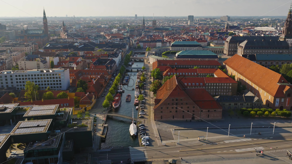 Aerial drone view of Christianshavn canal with red-roofed historic buildings and docked boats in central Copenhagen, Denmark Royalty Free Stock Video Footage