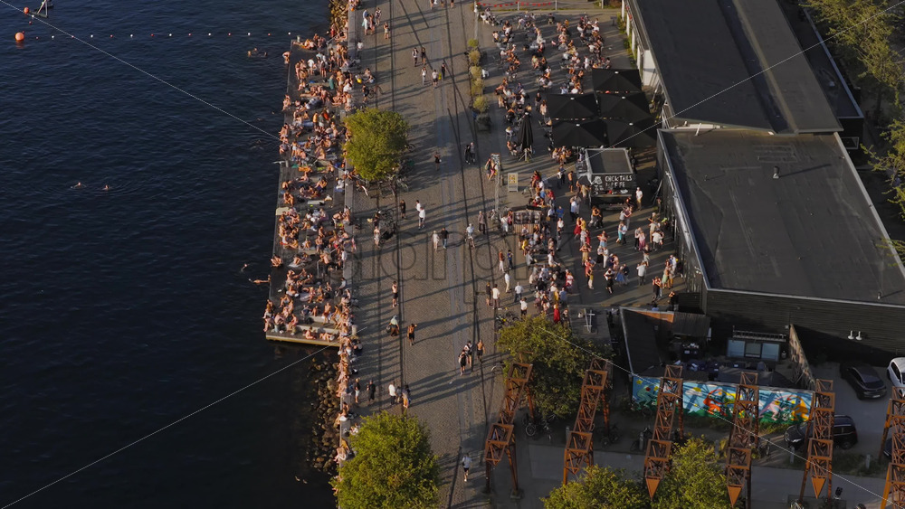 Aerial drone view of the busy Islands Brygge waterfront filled with swimmers, sunbathers, and cyclists in Copenhagen, Denmark Royalty Free Stock Video Footage